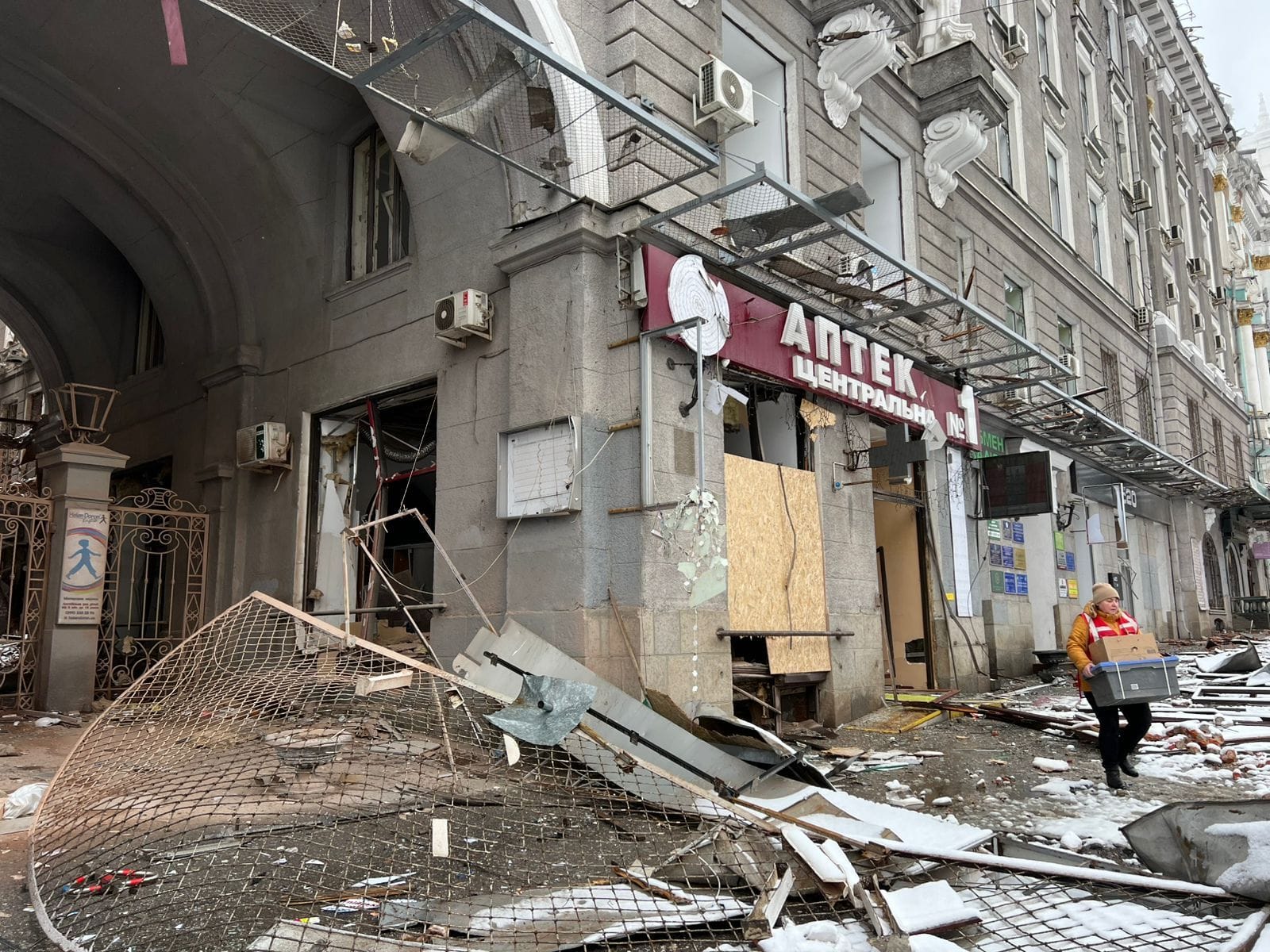 Палац Праці досі стоїть із пораненим фасадом. Але аптека на його першому поверсі знову відчиняє двері щодня.