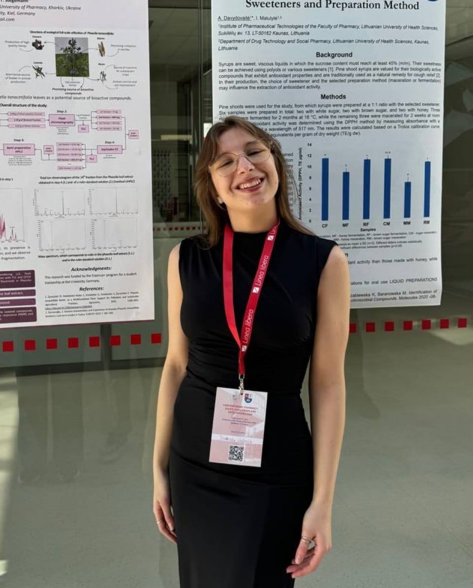 Фармація, як професійний напрям, захоплювала мене ще зі шкільних років. Це спонукало до пошуків закладу вищої освіти, де майбутні фармацевти можуть набувати цінних знань та навичок і розвивати свій потенціал. Найкращим для цього варіантом став Національний фармацевтичний університет – передовий заклад освіти, що понад століття виховує висококваліфікованих спеціалістів та науковців фармацевтичної галузі. Завдяки НФаУ я мала можливість впевнено просуватися шляхом науки не лише в Україні, але і закордоном. Безцінний досвід роботи в лабораторії Університету Бургундії, міста Діжон у Франції та тривалий період досліджень в лабораторії Фармацевтичної біології Університету Кіля в Німеччині як елемент академічної мобільності, був надзвичайно важливим та вирішальним у становленні мене як спеціаліста.