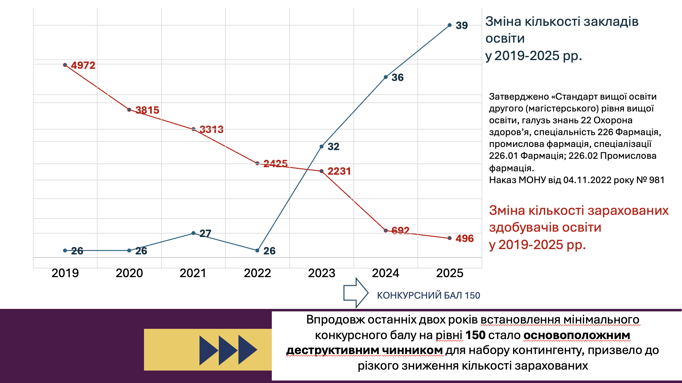 Доповнив дискусію Олександр Кухтенко, ректор Національного фармацевтичного університету. Він навів показові дані: у 2019–2025 роках кількість закладів вищої освіти, які здійснюють підготовку магістрів за спеціальністю 226 «Фармація, промислова фармація», зросла з 26 до 39, водночас кількість зарахованих студентів скоротилася більш ніж на 60 %.