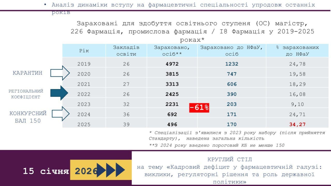 Підчас круглого столу «Кадровий дефіцит у фармацевтичній галузі» ректор Національного фармацевтичного університету Олександр Кухтенко навів дуже красномовні статистичні дані. Протягом 2019–2025 років спостерігається безпрецедентне скорочення контингенту вступників на фармацевтичні спеціальності: