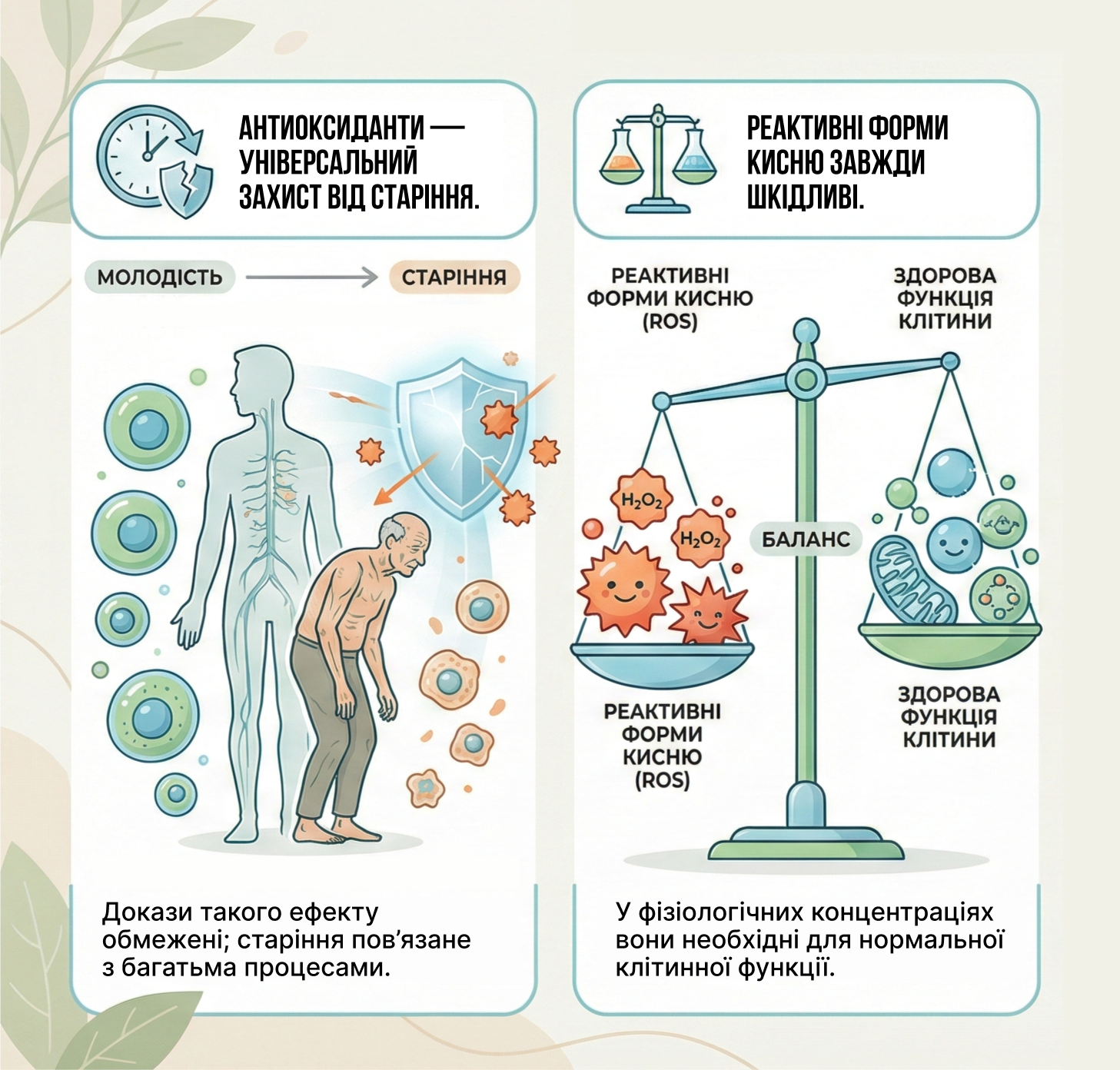 Але ключова проблема полягає в тому, що антиоксиданти не можуть замінити фізіологічний редокс-баланс. Сучасний погляд зміщується від ідеї «зменшити окислення» до ідеї «регулювати сигналізацію».