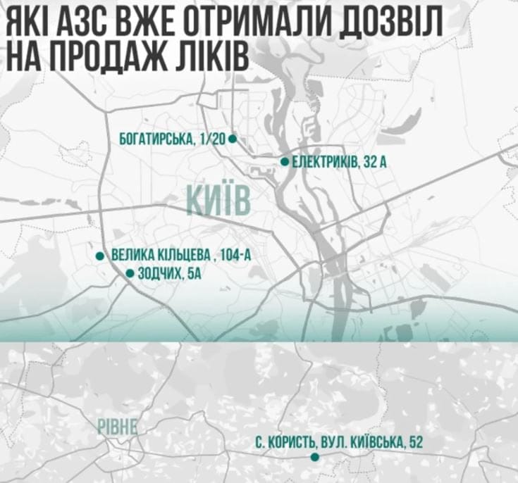 Станом на сьогодні продаж лікарських засобів організовано у п’яти точках мереж «ОККО» та «Укрнафта». Чотири з них розташовані у Києві: