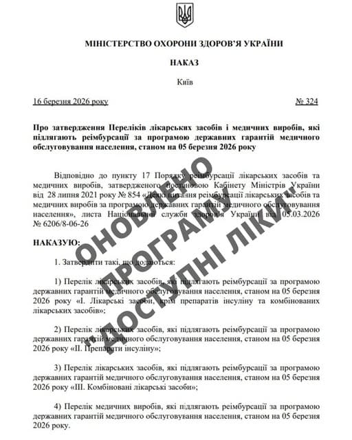 Міністерство охорони здоров’я оновило перелік лікарських засобів і медичних виробів, які підлягають відшкодуванню за програмою реімбурсації «Доступні ліки». Відповідний наказ №324 датований 16 березня 2026 року.