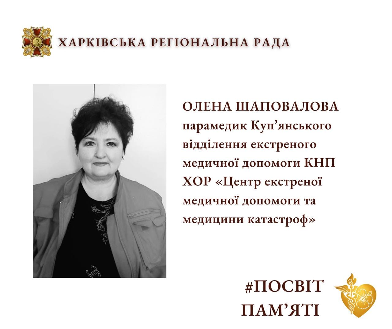 Парамедик Олена Шаповалова стояла біля витоків служби екстреної допомоги у своєму підрозділі. Вона працювала тоді, коли система лише формувалася, і залишалася в ній, коли навантаження ставало граничним. Її пам’ятають як людину, яка не відмовляла у допомозі — ні пацієнтам, ні колегам.