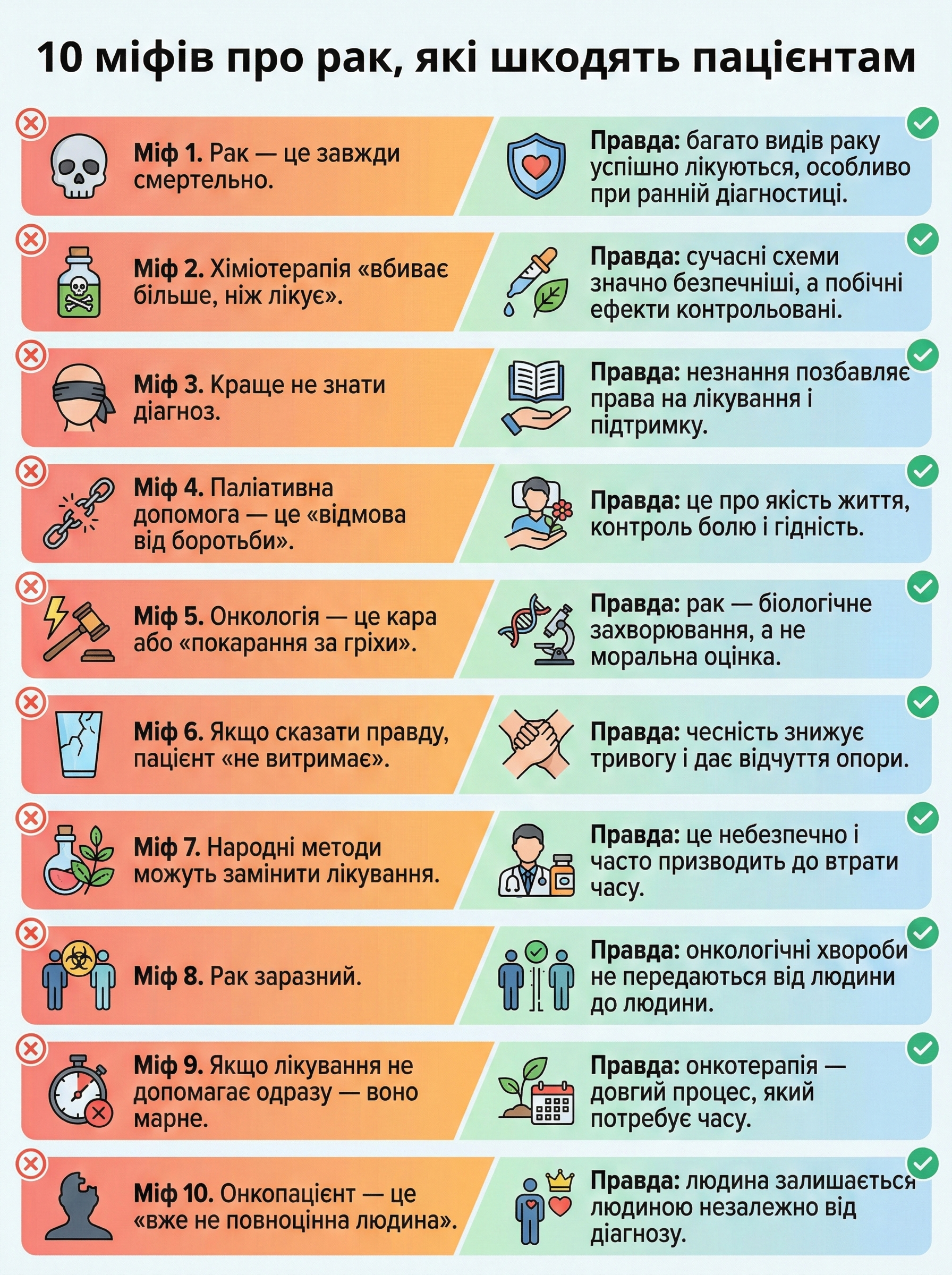 Попри розвиток медицини, рак в Україні й досі часто залишається темою, про яку намагаються не говорити вголос. Це спадок медичної культури, у якій вважалося, що правда може «зашкодити» пацієнту. Але багаторічна практика показує протилежне: шкодить саме її відсутність.