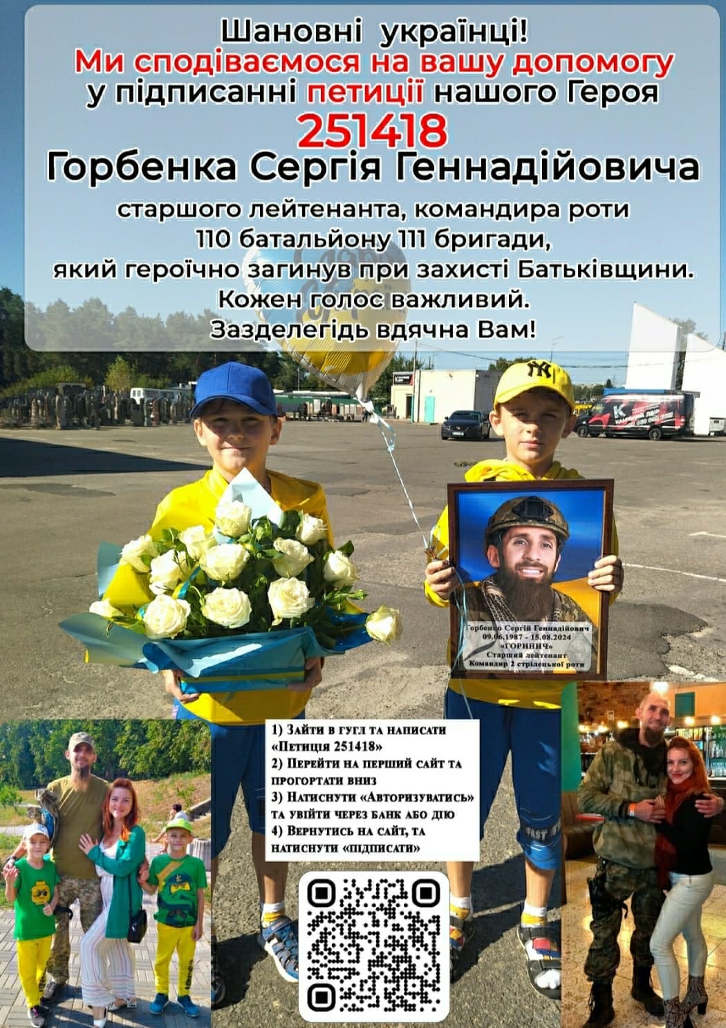 Небайдужі українці, від імені дружини, синів та родини просимо підтримати петицію про присвоєння почесного звання Героя України (посмертно) старшому лейтенанту Сергію Геннадійовичу Горбенку, командиру 2 стрілецької роти 110 батальйон 111 Обр ТрО. Зайдіть за посиланням https://petition.president.gov.ua/petition/251418 та поставте свій підпис.