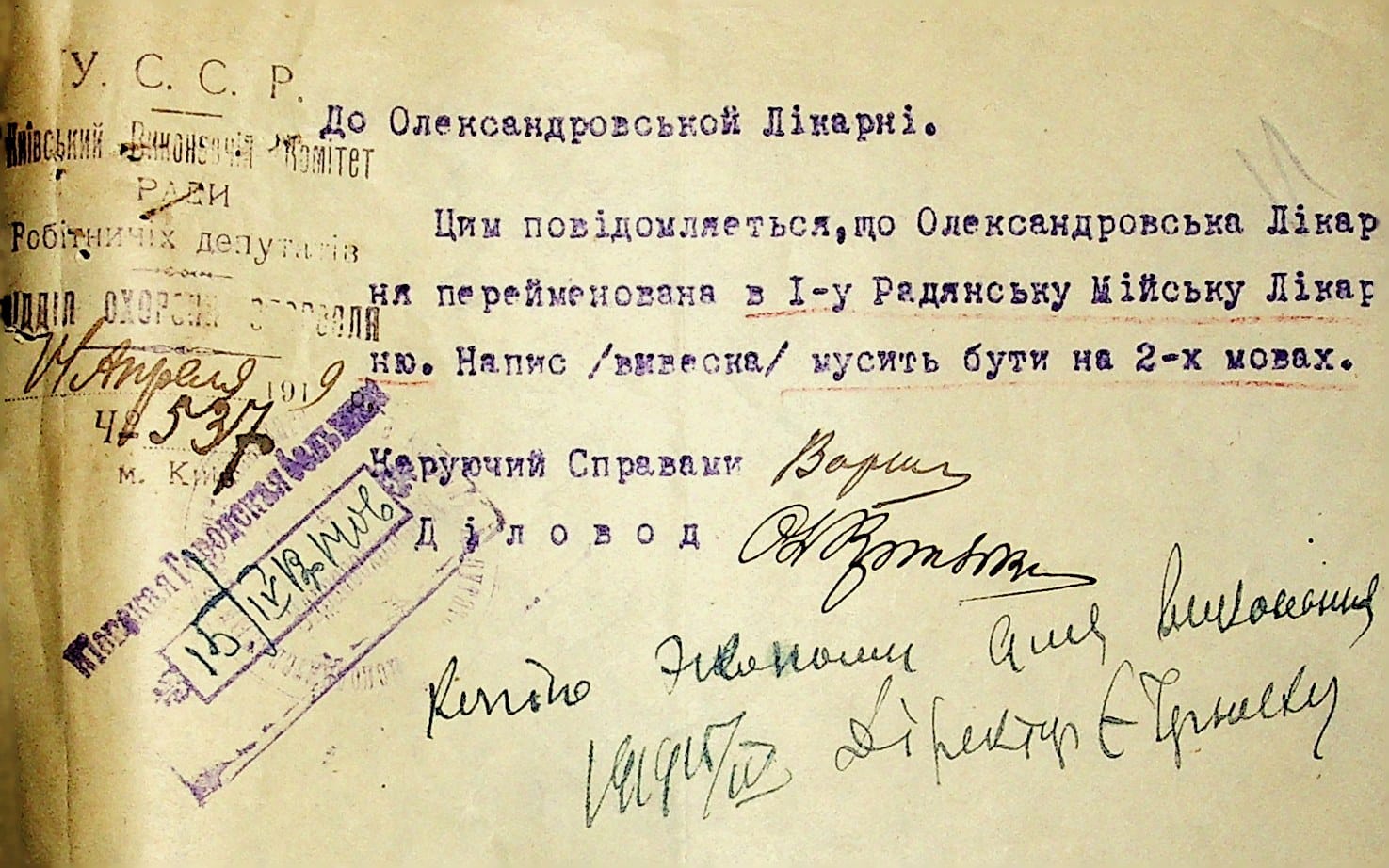 У 1919 році відділ охорони здоров’я Київського виконавчого комітету ради робітничих депутатів повідомив керівництву лікарні, що вона перейменована на І-у радянську міську лікарню, в 1922 році лікарні присвоєно ім'я жовтневої революції і в народі вона стає «Жовтневою».