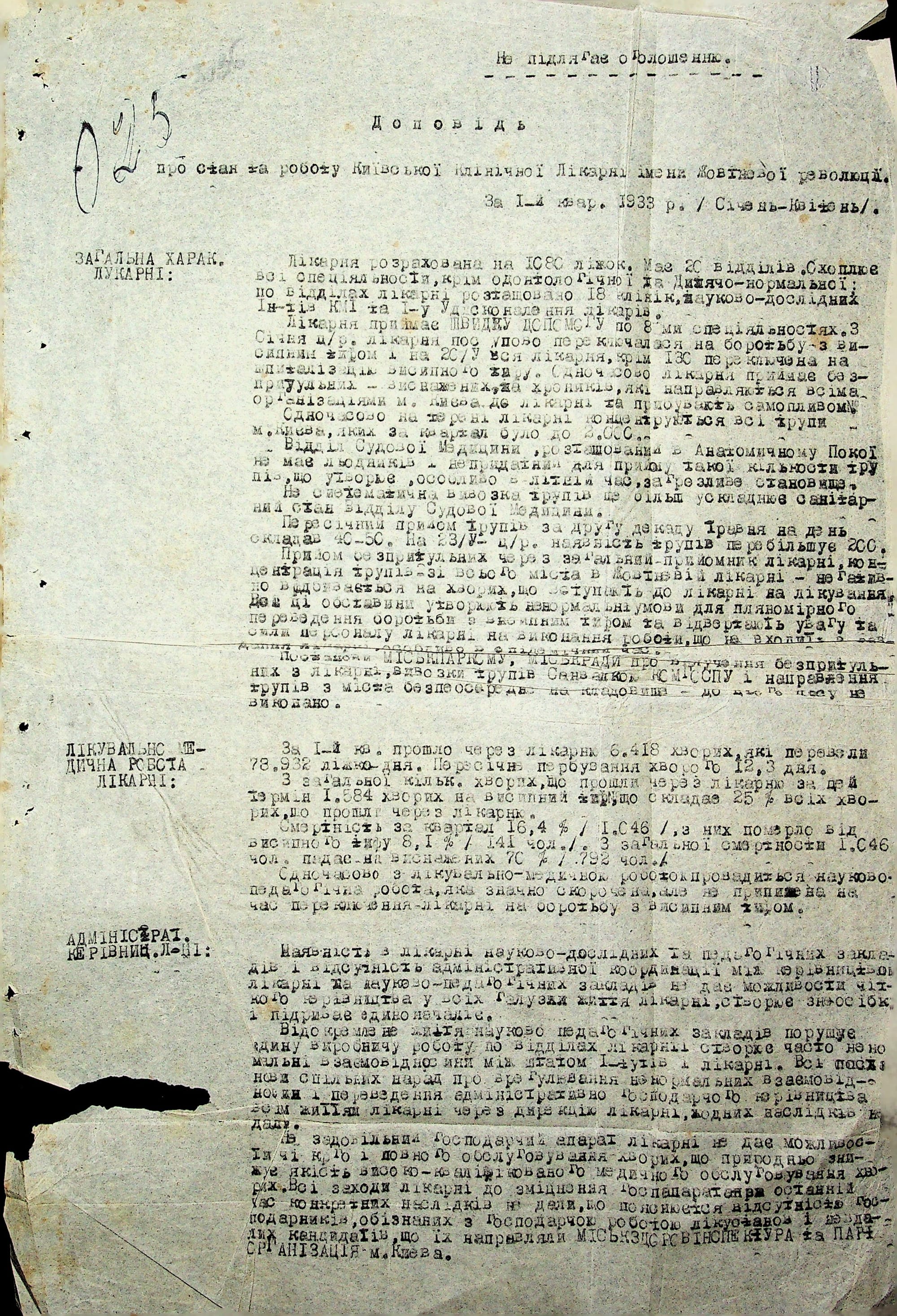 Період 1932–1933 років став одним із найтрагічніших у її історії. Сюди привозили виснажених селян, які шукали порятунку від Голодомору в Києві, — більшість не вдавалося врятувати. У ті ж роки місто охопила епідемія висипного тифу. Будівництво нових корпусів практично зупинилось через нестачу фінансування.