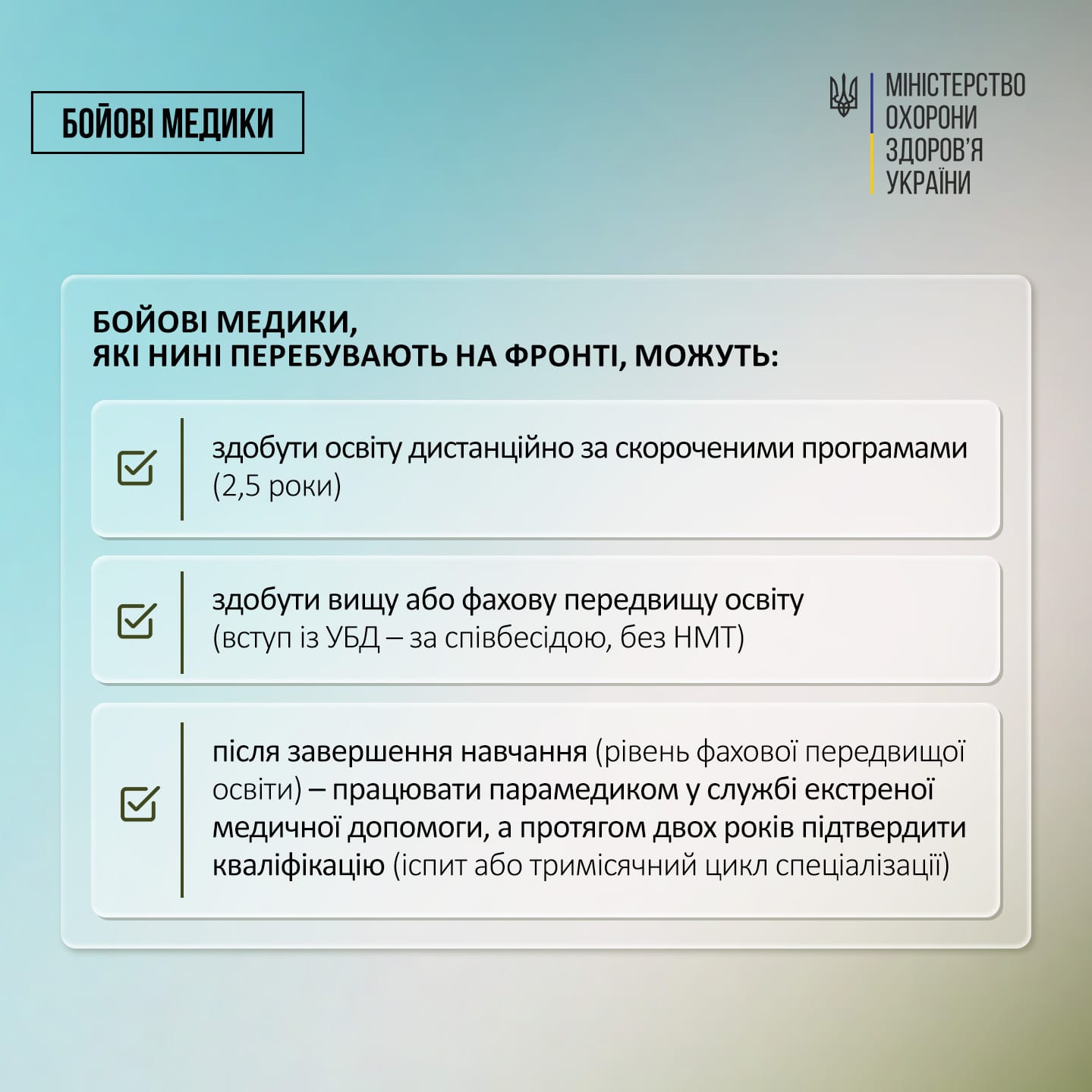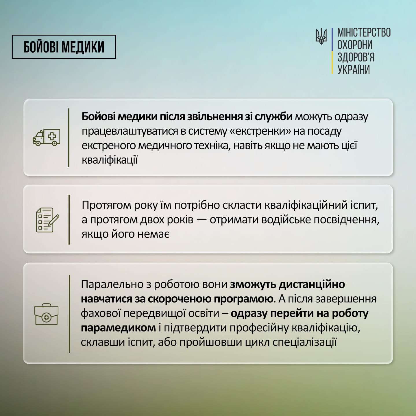 Мова йде про створення можливостей для тих, хто нині служить або вже завершив військову службу, здобути цивільну медичну освіту чи долучитися до системи охорони здоров’я. Відповідні зміни вже внесені до нормативної бази, що відкриває шлях до працевлаштування або навчання за фахом.