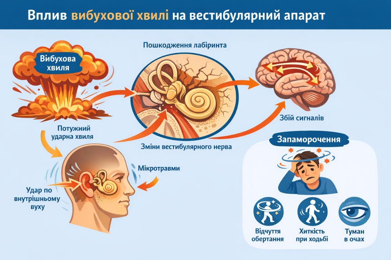 Вибухова хвиля — це не лише фактор гострої травми, а й невидимий тригер тривалих порушень, зокрема з боку вестибулярної системи. Запаморочення, нестійкість, порушення координації можуть зберігатися навіть у людей без очевидних ушкоджень і потребують уважного, системного підходу.