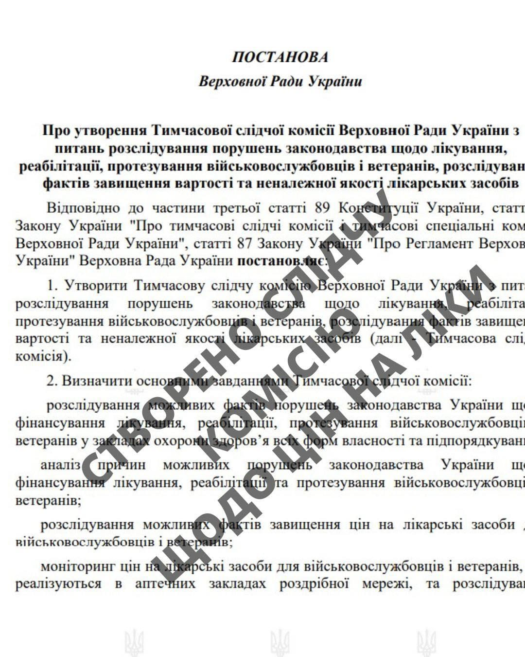 Верховна Рада України ухвалила Постанову №14181 про створення Тимчасової слідчої комісії (ТСК), покликаної розслідувати можливі випадки завищення вартості та неналежної якості лікарських засобів і медичних виробів, а також порушення у сфері лікування, реабілітації та протезування військових та ветеранів. За відповідну постанову проголосували 259 народних депутатів.