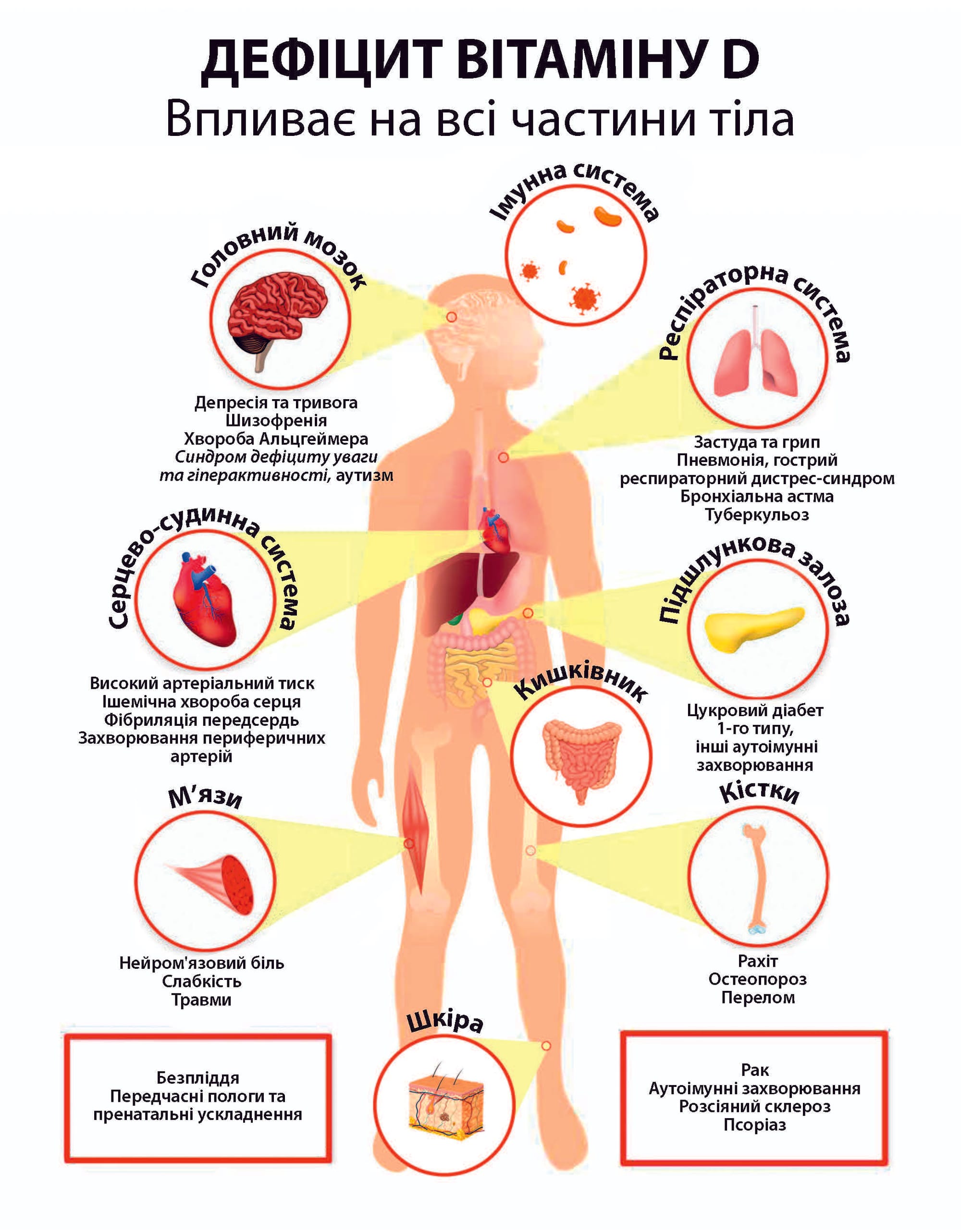 Його дефіцит асоціюється з високим ризиком розвитку різноманітних захворювань, починаючи від остеопорозу та м’язової слабкості до депресії, серцево-судинних подій, інфекцій, аутоімунних і метаболічних розладів (рис. 1) ⁽⁹⁾.
